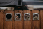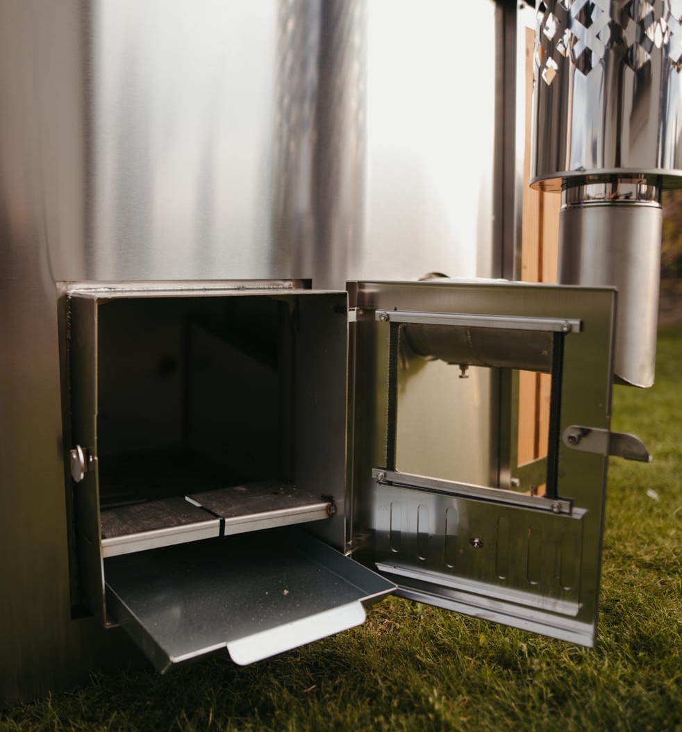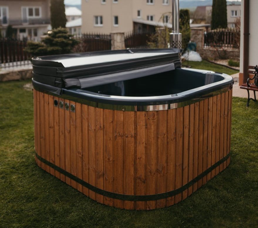 Wir bieten neue Hot Tubs in der Größe 202 × 202 cm an, ausgestattet mit einem externen Holzofen aus Edelstahl inklusive Schornstein.