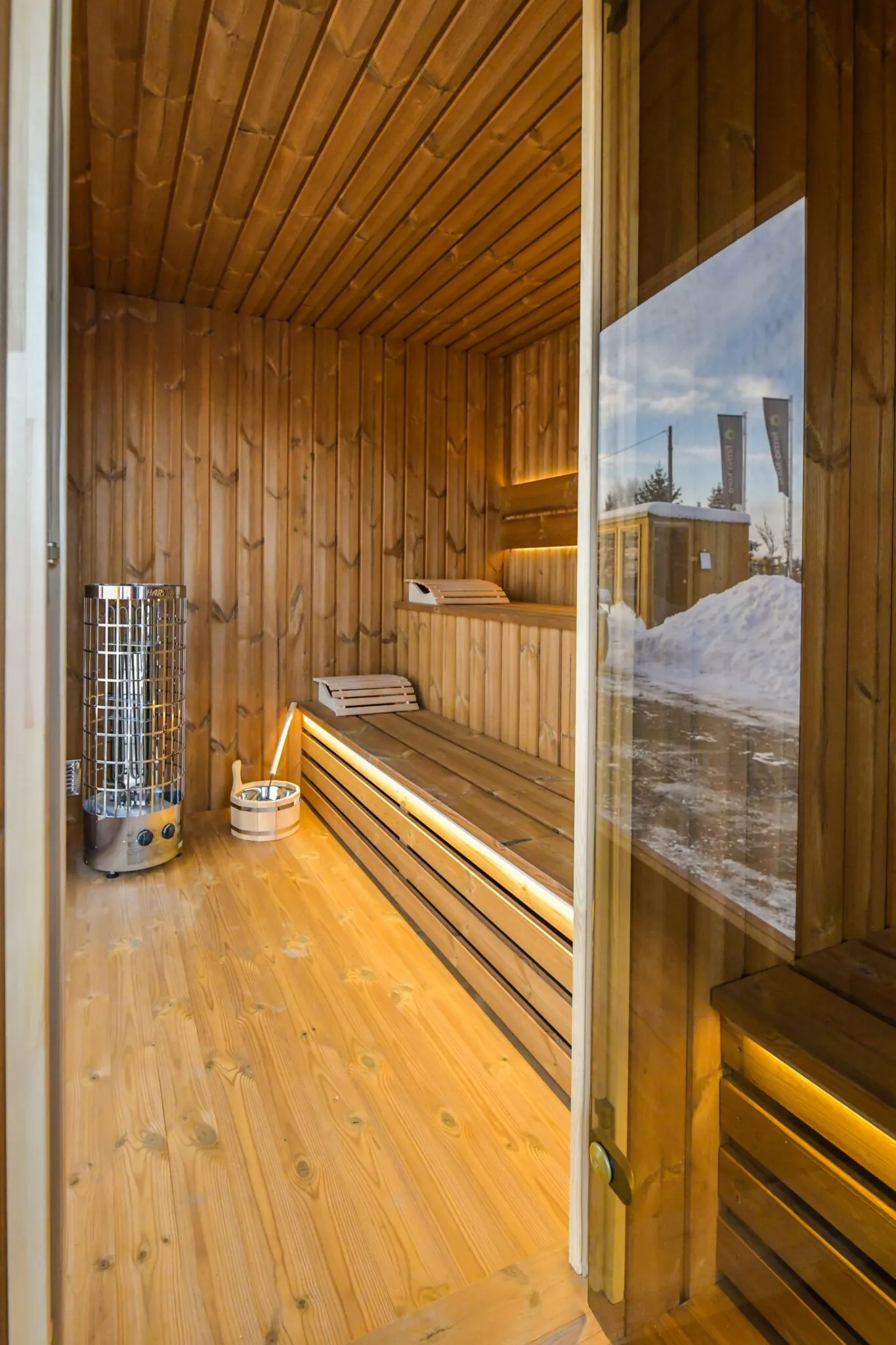 Das charakteristische Merkmal der Sauna Thermo Premium ist vor allem ihre einzigartige Konstruktion. Ihre Basis ist ein Rahmen aus Fichtenholz, der zusätzlich die Aufrechterhaltung der Innentemperatur verbessert. Die lange Lebensdauer dieses Modells wird jedoch durch die von außen angebrachten Paneele aus demselben Material beeinflusst. Unter anderem gerade dank ihnen kann sie sich einer so hohen Widerstandsfähigkeit im täglichen Gebrauch erfreuen. Dadurch kann die Sauna Thermo Premium ihren ursprünglichen und einwandfreien Zustand bis zu 25 Jahre lang ohne Imprägnierung beibehalten. Zudem ist sie vollständig mit bis zu 50 mm dicker gepresster Wolle gedämmt (einschließlich Decke und Boden). Dank dieser Lösung ist ein Entweichen warmer Luft aus der Sauna nahezu unmöglich.